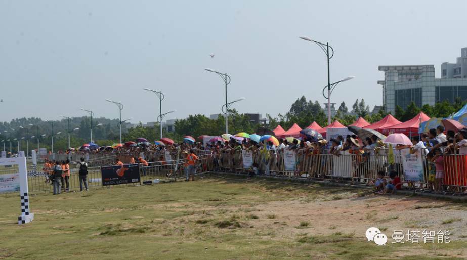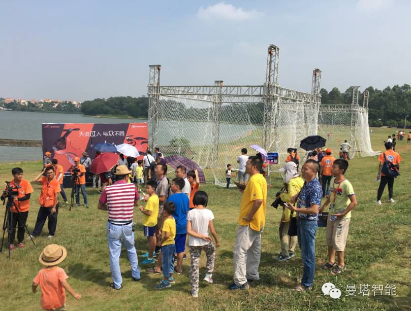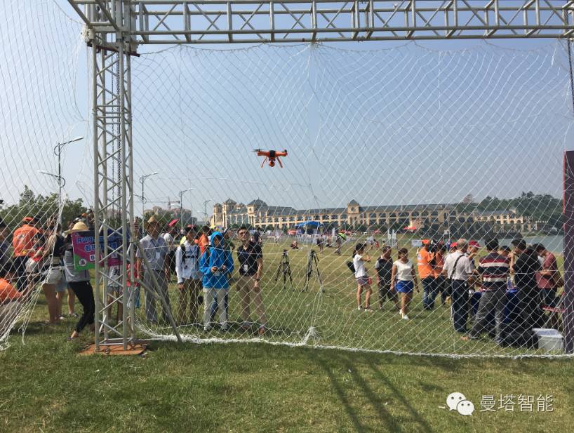 赛场一侧,曼塔智能8月推出的首款掌上智能无人机的展板和两个试飞区。